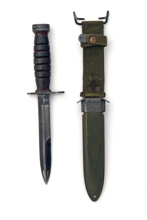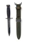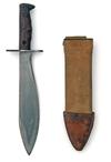 spanning the 20th century, the first an M17 trench raiders knife signed 'PLUMB. PHILA' and dated 1918, with heavy 10 1/4in. bolo blade, riveted wood grip and iron 'skull-cracker' pommel complete with its leather and brass mounted canvas scabbard dated 1918 by the maker 'BRAUER BROS', the second a MK2 knife of the type issued to the US Marine Corps complete with leather scabbard, the third a so called 'Carson Raider Gung-Ho' type signed 'COLLINS & CO, LEGITIMUS, MADE IN USA NO. 18' with 9in. heavy bolo style bowie blade, brass cross-guard and machete-style hilt (no scabbard), the fourth an M4 bayonet in a World War Two dated M18A1 scabbard and the last a US utility knife signed 'CATTARAUGUS' (feint) with the ordnance number 225Q, with leather bound hilt and a leather scabbard (worn throughout), TOGETHER WITH a signed and dedicated first edition copy of the book 'FIGHTING KNIVES' by F. J. Stephens and published by Arms and Armour Press (excellent with dust jacket)