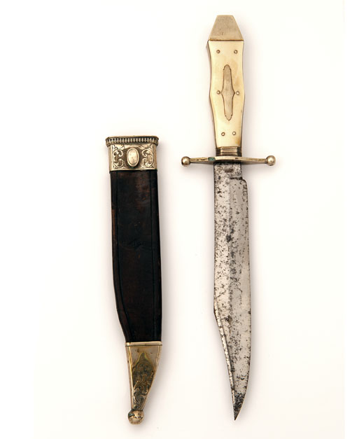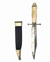circa 1880, with clip-point 8 1/4in. blade signed 'MANSON, SHEFFIELD' at the ricasso, the blade false-edged for the last 3 1/2in., straight nickel-silver cross-guard with ball finials, nickel-silver coffin-shaped hilt with heavyweight pommel, marine ivory smooth, flat scales held by six pins, inlaid plain nickel-silver escutcheon to left hand side TOGETHER WITH its original nickel-silver mounted leather scabbard, the locket with gadrooned throat and engraved with American scrolls to the front, crudely initialled 'W.I.' to reverse, the chape en-suite with ball finial (some staining to blade, age cracking to scales and minor imperfections throughout)