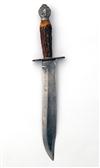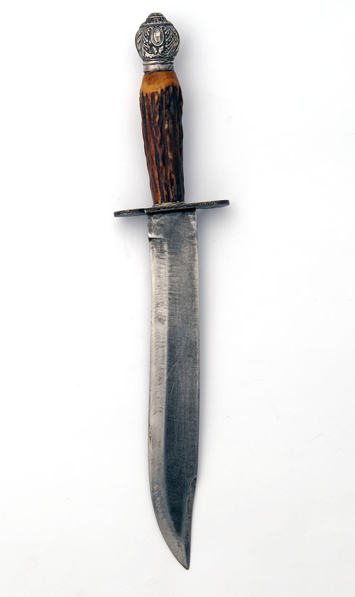 all mid to late 19th century, the first with unsigned 9 3/4in. clip-point blade decorated along the spine, with an iron and brass-mounted stag-horn grip (no scabbard), the second, similar, the back of blade stamped 'SALEM', with stag-horn cutlery-style hilt with embossed silver pommel (no scabbard), the third with deep 7 1/4in. clip-point crudely formed blade typical of Confederate manufacture (edge removed), brass cross-guard with acorn finials and stag-horn grip with nickel-silver pommel-cap and amateur produced possibly period leather scabbard, the last also typical of Confederate manufacture with 9in. fullered spear-point blade cut down from a sword, crude iron cross-guard and ferrule, antler grip with iron pommel-plate in a period amateur produced leather scabbard with embossed decoration and initialled 'J. C.', the reverse with an old gummed paper label stating 'MISSUS COOPER GAVE THIS KNIFE. HER GRANDADDY HAD IT AT KENTUCKY 100 YEARS AGO',