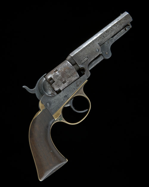 for 1865, with 4in. octagonal barrel signed on three lines 'COOPER FIREARMS MFG. CO. FRANKFORD, PHILA. PA., PAT JAN. 7 1851, APR 25 1854, SEPT 4 1860', the third line with further illegible patents, plain cylinder, plain iron frame, brass grip-straps and trigger guard and smooth walnut grip, the whole stained with some surface corrosion, mainspring broken or missing