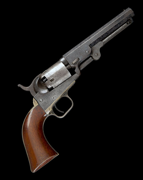 for the first year of production,1853, with 5in. blued octagonal, sighted barrel signed 'ADDRESS COL. COLT LONDON', cylinder with stage coach scene (faint) and also stamped '2', plain colour-hardened frame (faded), silver-plated brass grip-strap and trigger-guard, varnished one-piece walnut grips, colour-hardened under-barrel rammer, and matching numbers throughout, the whole retaining a good proportion of original finish
