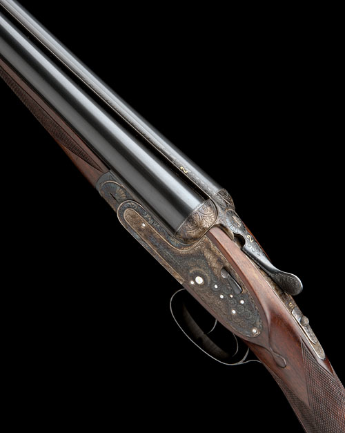 26in. nitro chopperlump barrels, 2 3/4in. chambers, bored approx. true cyl. and 1/4 choke, engraved arcaded fences, removable striker discs, automatic safety, hand-detachable lockplates, gold-inlaid cocking-indicators, articulated front trigger, rolled-edge triggerguard, acanthus scroll engraving, retaining virtually full original colour-hardening and finish, 16 3/4in. stock including 2 1/4in. wooden extension, weight 6lb. 15oz., with a canvas and leather slip