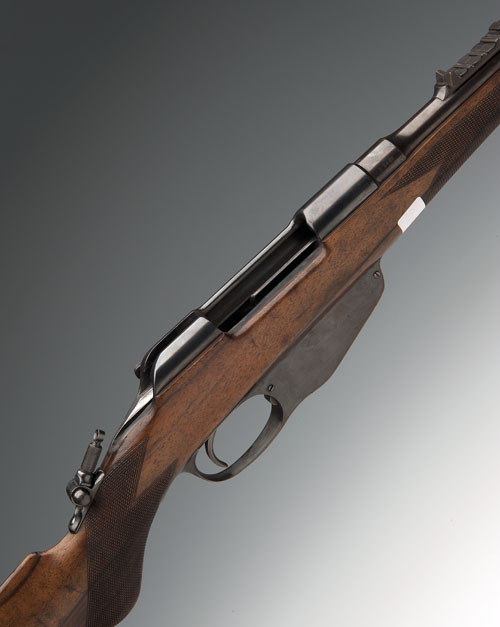 STEYR 6.5mm 'STEYR 1893' BOLT-MAGAZINE SPORTING RIFLE, serial no. B2465, 26 1/2in. nitro barrel with block-mounted bead fore-sight, rear-sight of one standing and three folding leaves with platinum-inlaid centre-lines and calibrated up to 400 yards and with ladder sight calibrated up to 1,200 yards, the hand fitted with a patent flip-up adjustable peep-sight, semi-pistolgrip stock with sling eyes, steel buttplate, 14in. pull, bolt missing