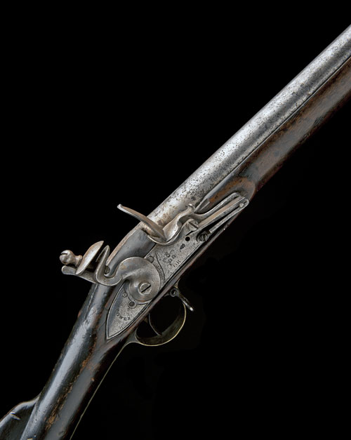 circa 1810, with 39in. smoothbore barrel, Tower proofs, block fore-sight, slightly curved and radiused border-lined lockplate stamped with a crown over 'G.R.' cypher forwards of the hammer and 'TOWER' at the tail together with various ordnance inspectors stamps, walnut three-quarter stock of hand-rail style (numerous old repairs and inlets), flat triangular comb, the left hand side of butt stamped '244', brass furniture, iron swivels and replacement iron ramrod (exposed iron surfaces cleaned with staining and mild pitting) TOGETHER WITH a period bayonet (no scabbard, condition similar)