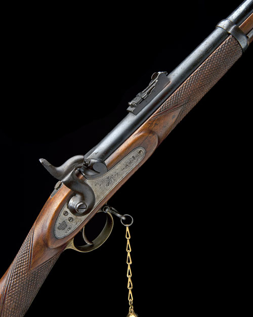 dated for 1855, with blued 38 1/4in. barrel, block and blade fore-sight, ladder rear-sight, sold out of service stamps to breech, colour-hardened border-lined lockplate dated '1855' forwards of the hammer and 'V.R.' crown and cypher to the tail, walnut three-quarter military-style stock with possible later chequering, brass furniture, the top-spur of heel-plate engraved 'HTF C41'? (faint), three iron barrel-bands and iron ramrod, fair amount of original finish throughout