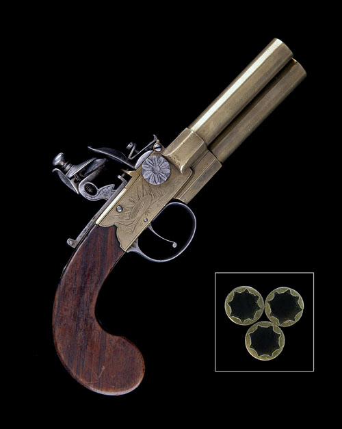 circa 1780, with 3 1/2in. turn-off barrel cluster (frozen) of triangular formation, false rifling to the muzzles, the respective breeches and barrels numbered 1 through 3, slab-sided boxlock action engraved with flag trophies and signed 'ROLLS' on the left and 'LONDON on the right hand side within ovals, three position selector switch mounted on the left hand side with florally engraved pan head on the right, centrally mounted border-line engraved hammer, sliding safe to the engraved top-tang, walnut slab-sided butt with silver oval to wrist, florally engraved trigger-guard bow and private proofs with the makers mark 'J.S.'