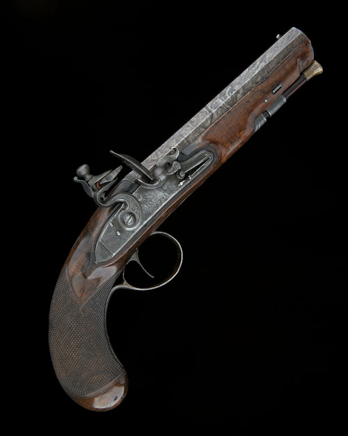 circa 1800, with slightly swamped 6in. browned octagonal barrel, the top-flat signed 'T. & I. REA, MINORIES, LONDON' (faint), bead fore-sight, gold line to the hooked breech with engraved bands, engraved top-tang, flat, slightly curved bevel edged lockplate with stepped tail signed 'T. & I. REA', roller frizzen, hammer a probable working replacement, walnut full-stock with chequered bag-shaped grip, iron furniture, engraved trigger-guard bow with rolled edges, pineapple finial and brass-tipped ramrod