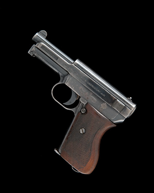 circa 1939, with exposed, blued 3 1/4in. barrel, crescent fore-sight, dove-tailed notch rear-sight, the left hand side of slide signed 'MAUSER-WERKE A.G. OBERNDORF A.N.', the right hand side marked 'CAL 7,65 D.R.P.u.A.P.', blued frame with Mauser trade mark and the German Kriegsmarine mark of a stylised eagle over the letter 'M', the front grip-strap stamped 'O.1862', chequered walnut one-piece grip, much original (faded) finish throughout