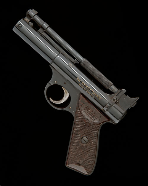 circa 1959, with blued 6 1/2in. barrel, blued air chamber marked 'THE WEBLEY "SENIOR" MADE IN ENGLAND' on the left hand side, 'WEBLEY & SCOTT LTD BIRMINGHAM 4' and 'WEBLEY PATENTS' on the right, three pin trigger unit and brown bakelite chequered grips, the whole remaining in fine order with isolated storage marks