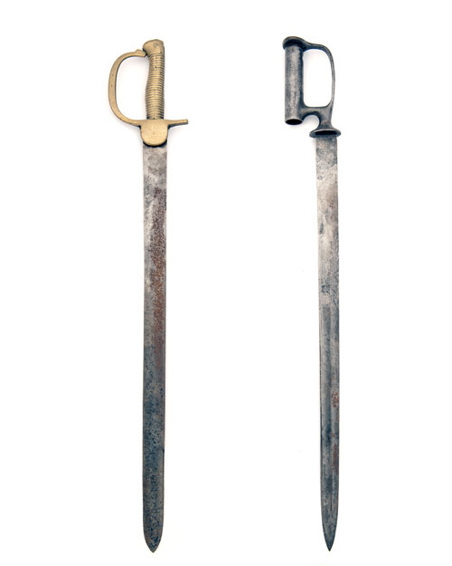 the first, a second pattern model for the Baker Flintlock Rifle circa 1801, unsigned, missing its locking catch, spring and scabbard, the second a bayonet for the Sappers and Miners Carbine circa 1845 signed 'HEIGHTINGTON' with additional but contemporary knuckle-bow, fullered 22 1/4in. blade, missing scabbard, both with some mild corrosion and light pitting