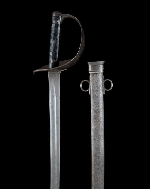 dated for 1899, with fullered 33 1/2in. spearpoint blade, makers stamp of 'EFD' for Enfield at the forte, plain iron half-basket hilt with reinforced left-hand edge, chequered hard rubber grips TOGETHER WITH its original steel scabbard with opposed suspension loops at the throat (exposed iron surfaces with mottled staining)
