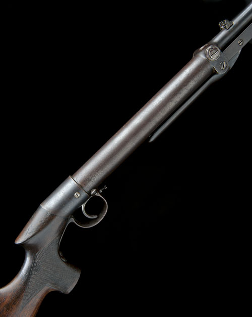 circa 1908, with 19 1/4in. tapering barrel, barleycorn fore-sight, rear-sight with elevating blade, plain air chamber stamped 'H. THE LINCOLN AIR RIFLE. PATENT, MANUFACTURED BY THE BSA CO LD BIRMINGHAM', chequered full pistol-grip with saw-back, butt-stock with iron heel-plate, the left hand side of butt stamped 'H. WILLIAMS' (twice), the right hand side stamped 'REGISTERED LINCOLN JEFFERIES, 121 STEELHOUSE LANE, BIRMINGHAM' and 'REGD TRADE MARK' beneath a standing figure of a male shooter, cast trigger-guard with full tang and 'spade' cocking-lever with chequered grip-piece (traces of finish throughout)