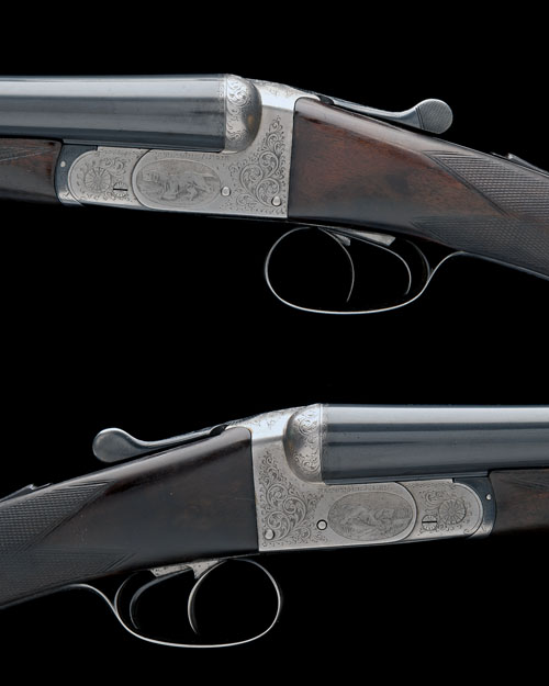 25in. nitro reproved barrels with Churchill-rib, tubes engraved 'PATSTONE & SON. 25 HIGH ST. SOUTHAMPTON. SILVER MEDAL. LONDON. 1885. PARIS. 1878.', 2 1/2in. chambers, bored approx. true cyl. and 3/4 choke, automatic safety with silver-inlaid 'SAFE' detail, border and scroll engraved action with two oval vignettes of pointer and spaniel, brushed bright and reblued finish overall, 15 3/8in. stock including 1in. rubber recoil pad, weight 6lb. 5oz.