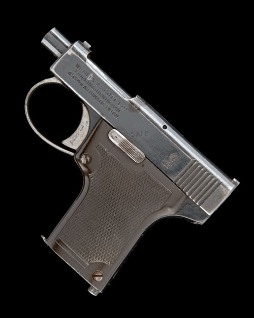 circa 1930, with 2in. barrel, sighted slide marked 'WEBLEY & SCOTT LTD, LONDON & BIRMINGHAM, 6.35mm AUTOMATIC PISTOL', frame with side safety, chequered hard-rubber grips, the whole retaining much original finish with some fading to high-spots