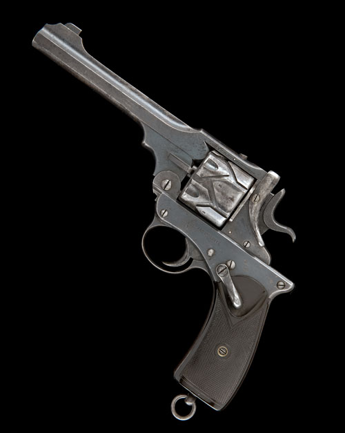 for 1904, with blued 6in. sighted barrel, stirrup catch with notch rear-sight, blued cylinder with 'zig-zag' indexing grooves, blued frame with detachable side-plate, safety lever mounted on left hand side, chequered hard-rubber grips (minor losses to both), lanyard ring at base the whole retaining a good proportion of original finish COMPLETE WITH a leather service holster in good condition by 'MARTINS BIRMINGHAM', dated for 1917 and inscribed for a 'G.R. FERGUSON'