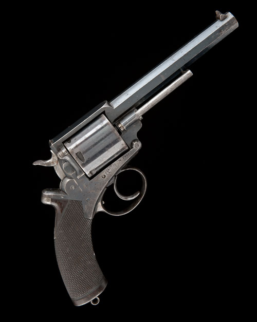 dated for December 1871, with blued octagonal barrel, dove-tailed block and blade fore-sight, sighting notch to top-strap, two-piece frame with side-plates, 'W.D.' over the Roman numeral 'II' stamped to left hand side of frame and the date stamp above trigger, plain blued six-shot cylinder with matching number, 'Adams Patent' and 'AJ' monogram trade mark overstamped with 'broad arrow' sold out of service marks to right hand side of frame, hinged loading gate (loose), chequered one-piece walnut grip, iron pommel-cap with eye for lanyard ring, separate half back-strap and captive under-barrel ejector rod, the whole retaining much original finish, some scuffs and fading to high spots.
