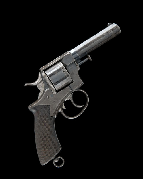 circa 1875, with 4 1/2in. ovoid barrel, crescent blade fore-sight, sighting groove to top-strap, the top-strap signed 'J. PATSTONE, 25 HIGH ST. SOUTHAMPTON', ejector rod swivel mounted around the barrel, plain cylinder with front locking notches, plain frame marked 'WEBLEY'S PATENT', hinged loading gate, chequered one-piece walnut grip (small crack near top), iron butt-cap with lanyard ring, traces of finish throughout (trigger return spring weak)