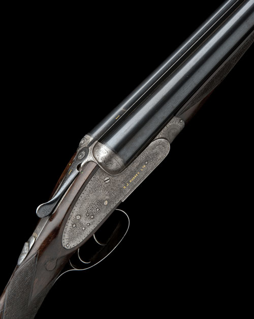 28in. nitro reproved barrels (in 2012), rib engraved 'H. J. HUSSEY LTD. 81 NEW BOND STREET. LONDON.', and gold-inlaid '1', 2 3/4in. chambers, bored approx. true cyl. and 3/4 choke, treble-grip action, toplever gold-inlaid '1', automatic safety with gold-inlaid 'SAFE' detail, gold-inlaid cocking-indicators, best bouquet and scroll engraving, the lockplates gold-inlaid with the makers name, the underside engraved 'IMPERIAL EJECTOR', retaining very slight traces of original colour-hardening, 14 3/4in. figured stock, overhorns pinned and repaired, including 7/8in. wooden extension, weight 6lb. 11oz.