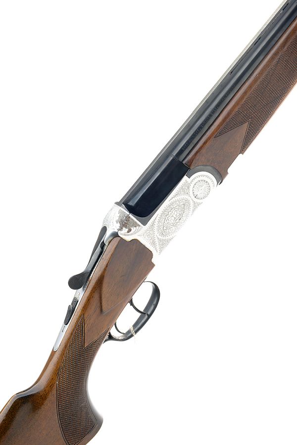 hold-open toplever, automatic safety, bouquet and scroll engraving, 14 1/2in. pistolgrip stock, weight 6lb. 4oz. (6lb. 7oz. with extra barrels)