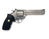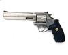with raised sighting rib and full length integral barrel-weight, red ramp fore-sight, adjustable rear-sight, swing-out fluted cylinder, double action mechanism and 'Colt' trademarked soft rubber finger-grooved grips