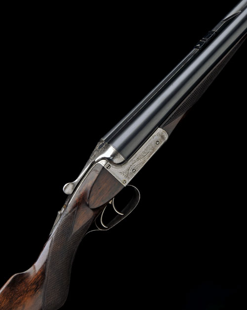 28 1/2in. nitro barrels with matt file-cut sighting flat with folding leaf sights for 100 and 150 yards, the sighting flat terminus engraved 'BALL & SHOT', the tubes engraved 'CHARLES LANCASTER. LONDON.', 2 1/2in. chambers, treble-grip action, automatic safety with gold-inlaid 'SAFE' detail, intercepting sears, border and partial scroll engraving, polished finish, 15in. figured semi-pistolgrip stock with steel buttplate, weight 7lb. 10oz.