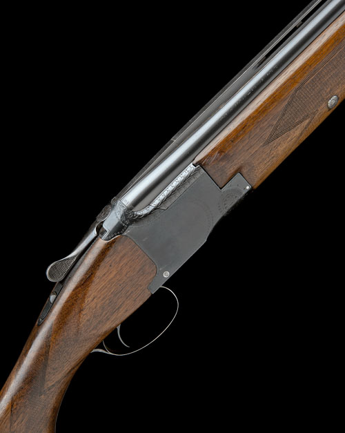 26 1/4in. nitro barrels with 8mm ventilated matt top-rib, 2 3/4in. chambers, bored approx. true cyl. in both, replacement extractors (by another), hold-open toplever, manual safety with integral barrel selector switch, border engraved blued action, 15in. semi-pistolgrip stock with comb insert and including 7/8in. ebonite extension, weight 7lb. 4oz.