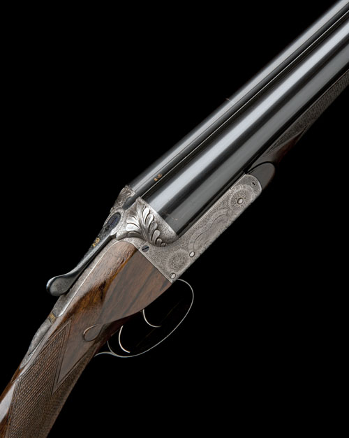28in. sleeved nitro barrels retaining original rib, 2 1/2in. chambers, bored approx. 1/4 and 1/2 choke, treble-grip action with carved leaf fences, slender toplever gold-inlaid '2', removable striker discs, intercepting sears, automatic safety with gold-inlaid 'SAFE' detail, best bouquet and scroll engraving, brushed bright and reblued finish overall, 15 1/2in. figured replacement stock, bolstered fore-end wood, weight 6lb. 10oz.
