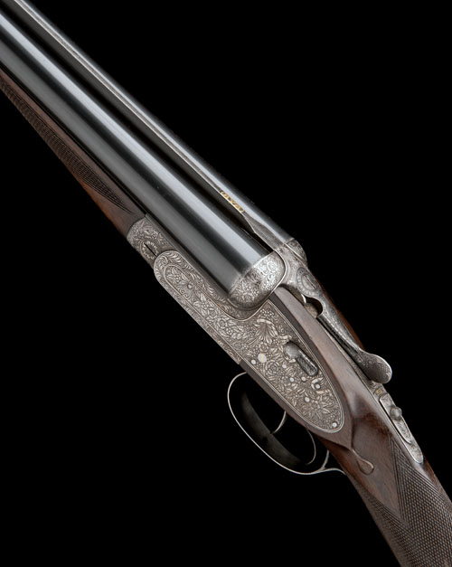 25in. nitro chopperlump barrels with matt Churchill-rib, 2 3/4in. chambers, bored approx. true cyl. and 1/4 choke, removable striker discs, automatic safety, hand-detachable lockplates, gold-inlaid cocking-indicators, articulated front trigger, rolled-edge triggerguard, profusely engraved with floral and scroll motifs, retaining very slight traces of original finish, 14 1/2in. stock, weight 6lb. 6oz.