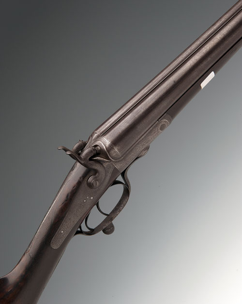 COGSWELL & HARRISON 12-BORE ROTARY-UNDERLEVER HAMMERGUN, serial no. 8344, 30in. black powder only damascus barrels (pitted), 2 1/2in. chambers, bored approx. true cyl. in both, Jones patent rotary-underlever, carved percussion fences, rebounding back-action locks with dolphin hammers, 14 1/4in. stock (cracked at hand)