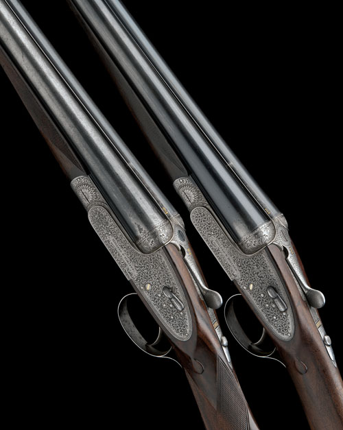 Provenance: The makers have kindly confirmed that this pair of shotguns were built, with 28in. barrels, for H. Peters. The no.1 gun was completed in 1915 and the no.2 gun, built to match, was completed the following year.