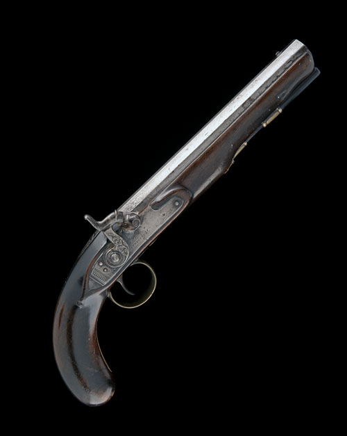 converted from flintlock circa 1835, with octagonal 9in. smoothbore barrel, bead fore-sight, solid, engraved top-tang, shielded drum and nipple conversion, flat border line engraved step-tailed lockplate signed 'ANDERTON & CO', scroll-engraved hammer, walnut full-stock with smooth bag-shaped grip, brass furniture and replacement ebony ramrod, exposed iron surfaces cleaned and brushed bright
