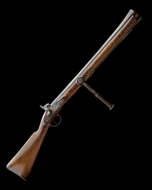 first half of the 19th century, possibly converted for flintlock, with heavy 28in. iron barrel, the bore widening to 2 1/8in at the muzzle, Birmingham proofs, solid top-tang, flat, slightly curved border-line engraved plain lockplate, heavy walnut full-stock, brass furniture including serpentine side-plate, fitted with a horseshoe style iron swivel mount approximately halfway along the fore-end and complete with its original iron ramrod