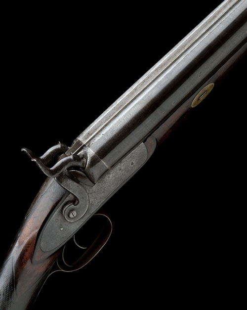circa 1850, with slightly shortened 37 1/4in. twist-steel barrels (ribs recently re-laid with subsequent loss to finish), bead fore-sight, hooked breech with plain top-tang, plain bar-action locks signed 'WILLIAM MOORE & CO', walnut half-stock chequered at the wrist, yellow-nickel furniture, twin take-down wedges and possible original brass-mounted ramrod