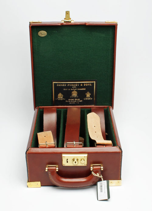fitted for approx. 150 cartridges, lined with green baize, two fixed dividers, three leather lifters, with a gold tooled leather 'JAMES PURDEY & SONS' trade label