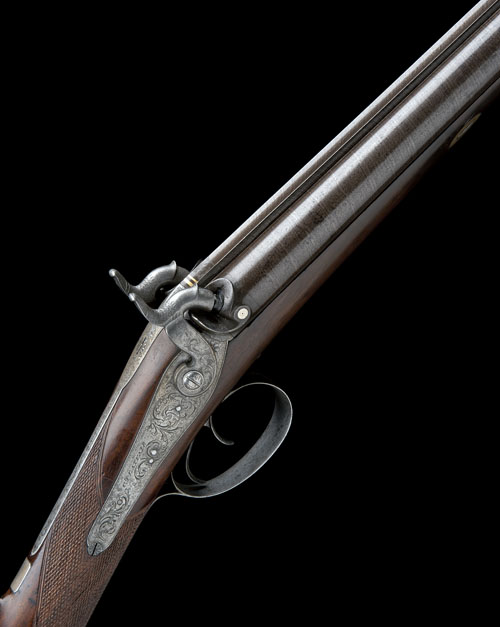 circa 1855, with 30in. re-browned barrels, marked 'ABERDEEN' on top rib,, engraved with a pheasant at the breech end together with twin gold lines, platinum plugs, hooked breech with long top-tang, border and scroll engraved back-action locks signed 'C. PLAYFAIR', scroll engraved dolphin headed hammers, walnut half-stock chequered at the wrist, engraved iron furniture and original ramrod