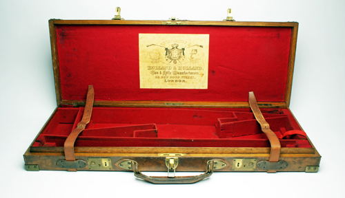 fitted for 29in. and 30in. barrels, lined with red baize, two brass lock (keys missing), the interior lid with a 'HOLLAND & HOLLAND' trade label, the exterior lid embossed with 'F.F.B.P. CORNER COTTAGE YATELEY'