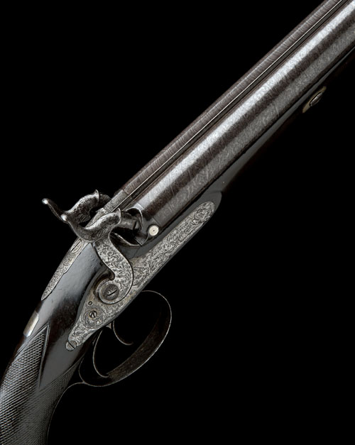 circa 1835, with slightly shortened 29 1/2in. barrels, traces of address on top rib, obscured serial number under barrels, engraved with a pheasant at the breech end, platinum plugs, flat, border and scroll engraved hump-backed locks with angled tails, signed 'WESTLEY RICHARDS' forwards of the hammers, scroll engraved dolphin headed hammers, walnut pistol-grip half-stock, chequered at the wrist, iron furniture, white metal ramrod throat and replacement ramrod, metalwork stained and discoloured throughout, wood lightly worn