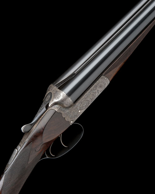 25in. nitro reproved barrels with sunken rib engraved 'BUTES LTD. 217A KENSINGTON HIGH ST. LONDON. W.8.', 2 1/2in. chambers, bored approx. true cyl choke in both, scroll-back treble-grip action, automatic safety with gold-inlaid 'SAFE' detail, best bouquet and scroll engraving, retaining much colour-hardening and finish, 14 3/4in. well-figured stock including 1 1/4in. ebonite extension, weight 6lb. 6oz.