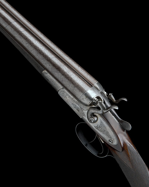 29 3/4in. nitro reproved damascus barrels, rib engraved 'E. WHITEHOUSE. MELTON MOWBRAY', 2 1/2in. chambers, bored approx. true cyl. and 1/4 choke, carved percussion fences, rounded bar, rebounding sidelocks, border and scroll engraving, 14 1/2in. stock including horn buttplate, weight 6lb. 14oz.