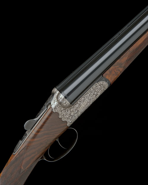 29in. nitro barrels, 2 3/4in. chambers, bored approx. 1/4 and imp. cyl. choke, Spanish made, scroll-back action, automatic safety, bold acanthus engraving, bright finish overall, 15 5/8in. figured stock including 1 1/8in. wooden extension, weight 6lb.