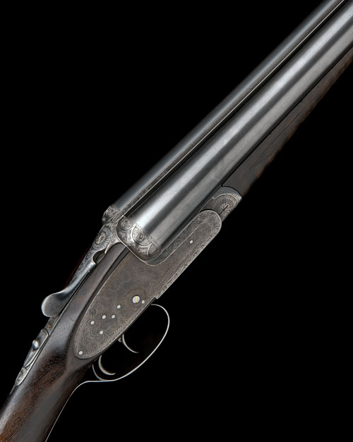 27 1/2in. nitro chopperlump barrels, 2 3/4in. chambers, bored approx. true cyl. and 1/4 choke, arcaded fences, removable striker discs, automatic safety, gold-inlaid cocking-indicators, rolled-edge triggerguard, fully scroll engraved, retaining traces of original finish, 14 3/8in. stock (chequering worn, repair to left overhorn and small chip to rear of top tang), weight 6lb. 13oz.