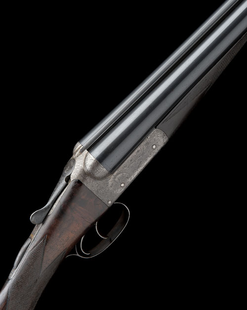30in. nitro reproved barrels, the rib engraved 'MIDLAND GUN CO. BIRMINGHAM.', 2 1/2in. chambers, bored approx. 1/2 and 3/4 choke, automatic safety with gold-inlaid 'SAFE' detail, fine acanthus scroll engraving surrounding vignettes of pheasant on the left, hounds on point on the right, the underside with a group of game birds, 14 1/4in. stock, weight 6lb. 9oz., in a leather case