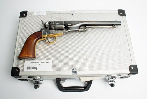 A REPRODUCTION .44 PERCUSSION SIX-SHOT REVOLVER SIGNED UBERTI, MODEL 'COLT FLUTED ARMY', serial no. 51437, with replacement 8in. barrel, fluted cylinder, colour-hardened frame and brass grip-straps with smooth walnut grips (finish worn, rammer at fault), TOGETHER WITH a fitted aluminium travel case