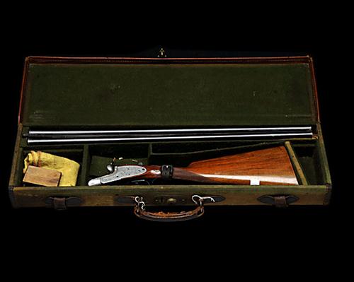 C. LANCASTER 12-BORE SIDELOCK EJECTOR, serial no. 14001, 28in. replacement nitro barrels, rib engraved 'BARRELS BY A. SANDERS LTD. 79 BANK ST. MAIDSTONE.', 2 1/2in. chambers, bored approx. 1/4 and 3/4 choke, treble-grip action with sideclips, automatic safety with gold-inlaid 'S' detail, bouquet and scroll engraving, 14 7/8in. stock, in a canvas and leather case