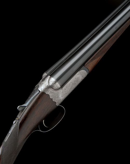 28in. replacement nitro barrels (circa 1957), rib engraved 'WESTLEY RICHARDS & CO.', 2 3/4in. chambers, bored approx. 1/4 and 1/2 choke, treble-grip scroll-back action incorporating J. Deeley and L.B. Taylor patent hand-detachable locks, patent no. 17731 of 28th July 1897, use number 1389, detachable triggerplate, automatic safety with gold-inlaid 'SAFE' detail, A.E. Lard patent selective single trigger, patent no. 3952 of 22nd February 1899, use number 1026, selector switch with gold-inlaid 'L' and 'R' details, best acanthus scroll engraving, the triggerguard with a pointer, brushed bright and reblued finish overall, 15 5/8in. figured replacement stock, fore-end (stiff to remove) with Deeley & Edge patent release catch and matching replacement wood, weight 6lb. 14oz.
