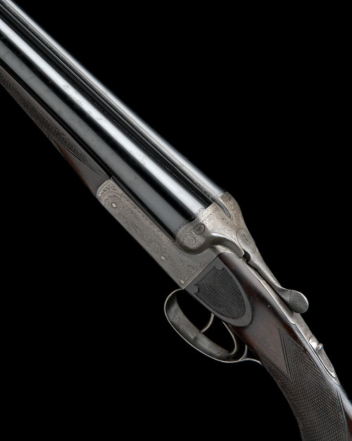 28in. nitro reproved barrels, rib engraved 'R. LEACH. GUNMAKER & PRACTICAL SHOT. OLDHAM.', 2 3/4in. chambers, bored approx. full choke in both, some external pits, treble-grip action with side-clips, automatic safety, border and scroll engraving, retaining very slight traces of original colour-hardening, 14 1/4in. semi-pistolgrip stock with chequered recessed side panels and horn buttplate, weight 7lb. 7oz.