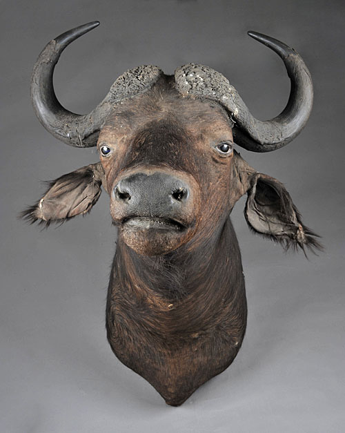 A CAPE AND HEAD MOUNT OF A CAPE BUFFALO
