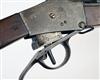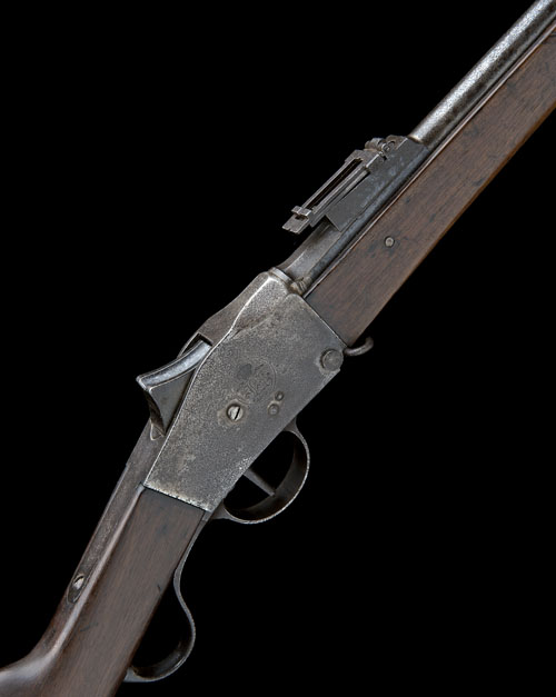 dated for 1886, with 32in. sighted barrel, slab-sided receiver with makers stamp and date on the left hand side and the Portuguese crest on the right (action with mild pitting, detail rubbed), under-lever opening, walnut butt-stock and three-quarter length fore-end, provision for clearing rod (missing)