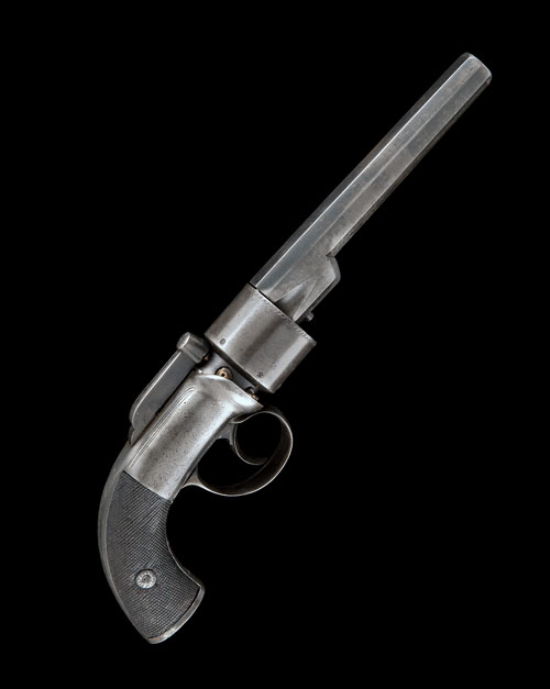 circa 1840, with 5 1/2in. octagonal unsighted barrel, plain cylinder with bronze nipples, rounded scroll engraved double-action only boxlock action with central hammer, iron frame with flat-based pommel, chequered walnut grips, the whole cleaned with some loss to detail