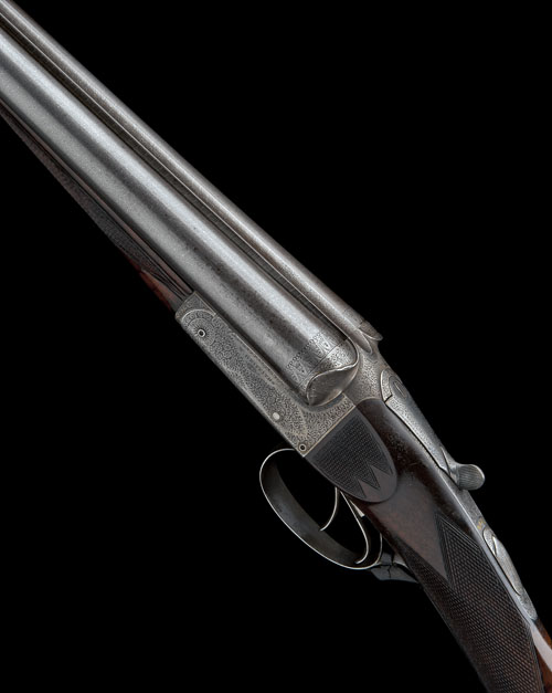 30in. nitro reproved fine damascus barrels, rib engraved 'WILLIAM GRIFFITHS. MANCHESTER.', 2 1/2in. chambers, bored approx. 1/4 and 3/4 choke, some dents, treble-grip action with carved serpentine fences, Westley Richards patent toplever, automatic safety with gold-inlaid 'SAFE' detail, fine acanthus scroll engraving, the triggerguard with a pointer, triggers bent to suit the left hand, 14in. well-figured stock with chequered side-panels and engraved steel heel and toe plates, bolstered fore-end wood, weight 6lb. 4oz.